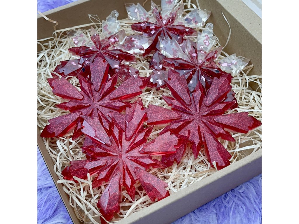 Ručně vyrobeno z epoxidové pryskyřice, pigmentu, drceného skla a třpytek.