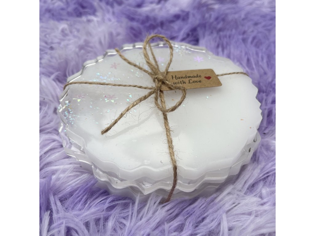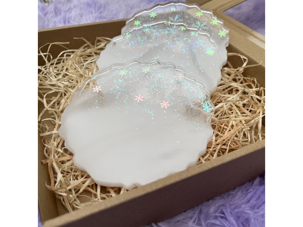 Podtácek je vyroben z epoxidové pryskyřice, pigmentu, třpytek a vloček.